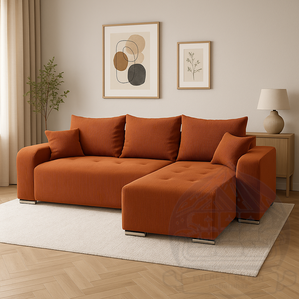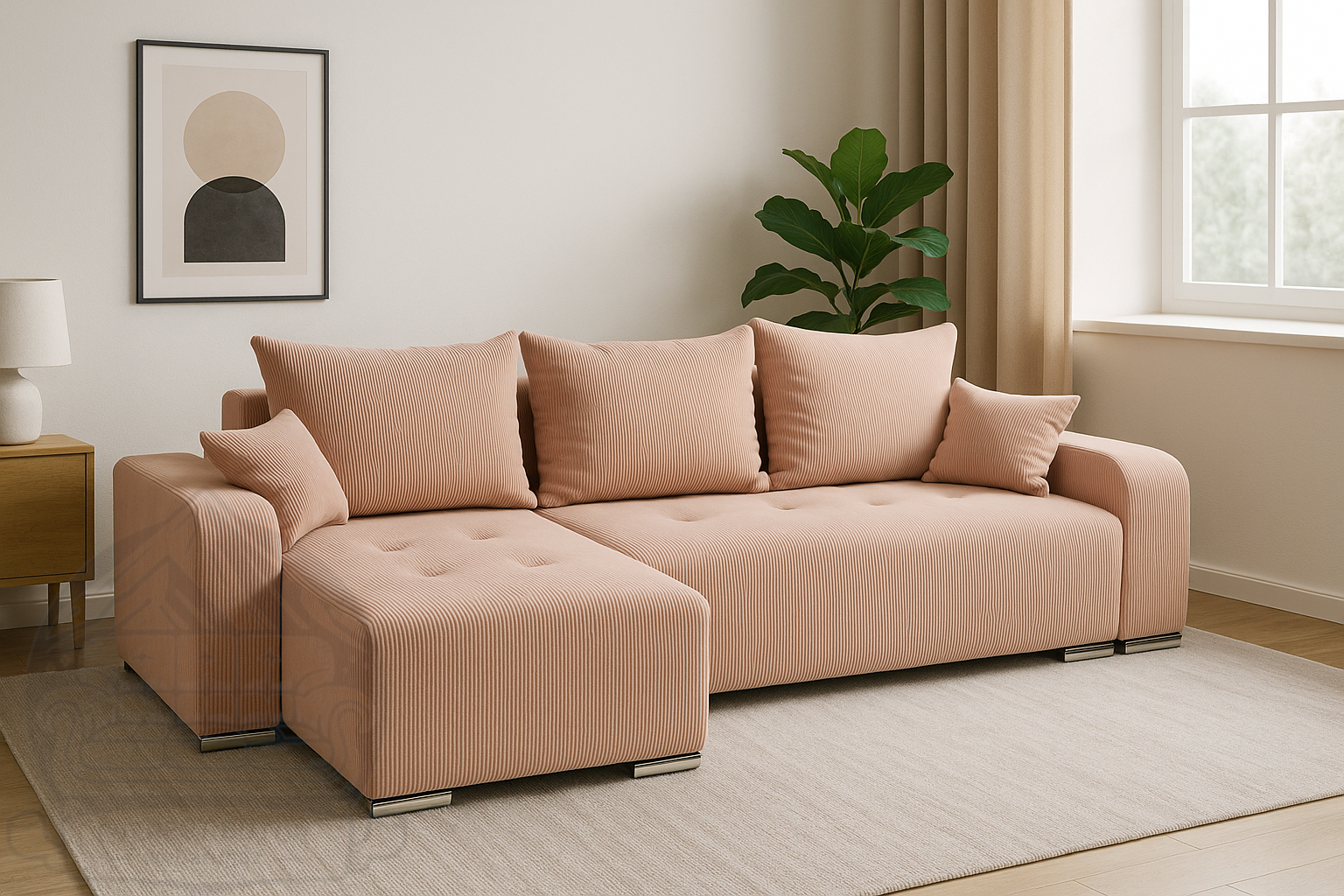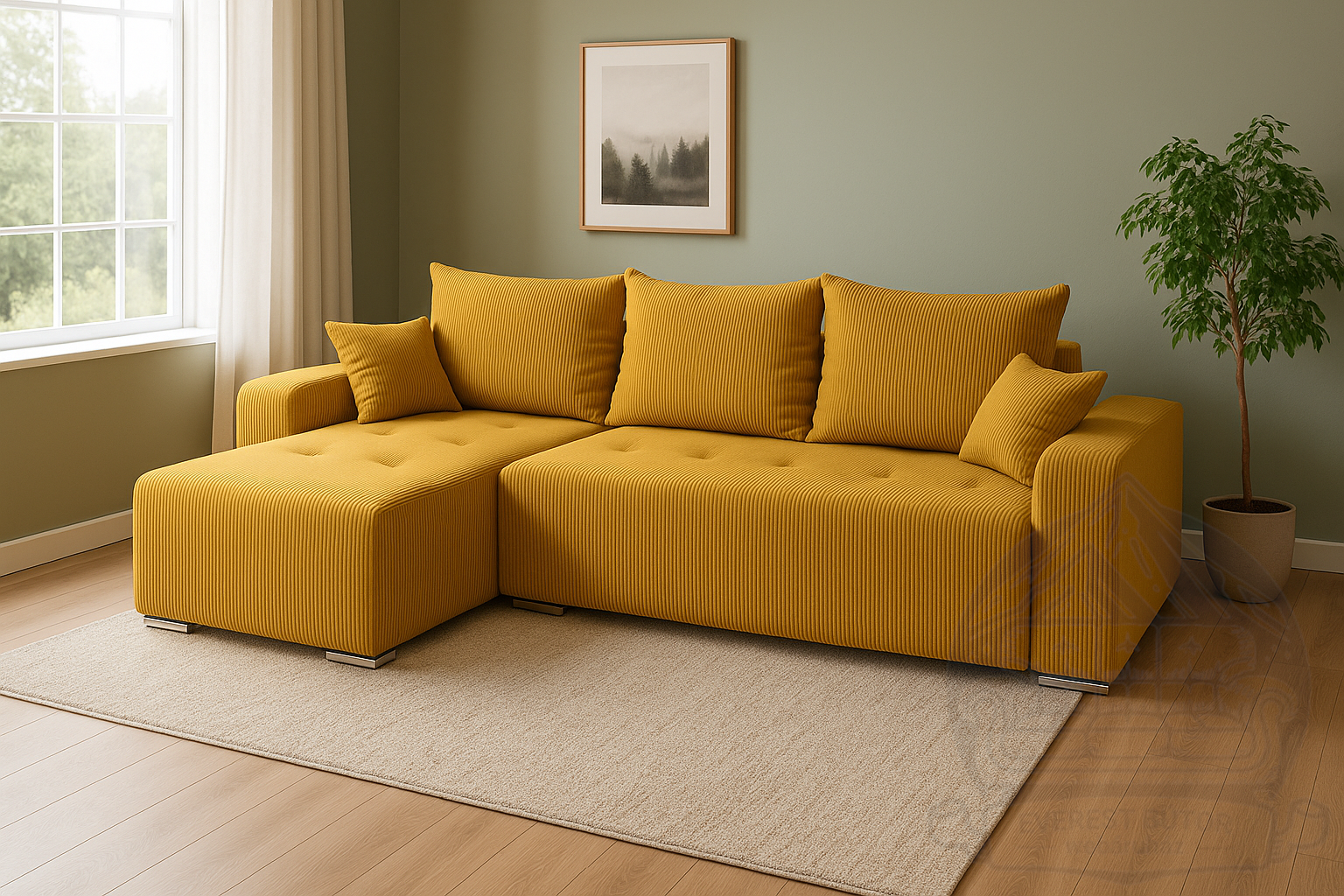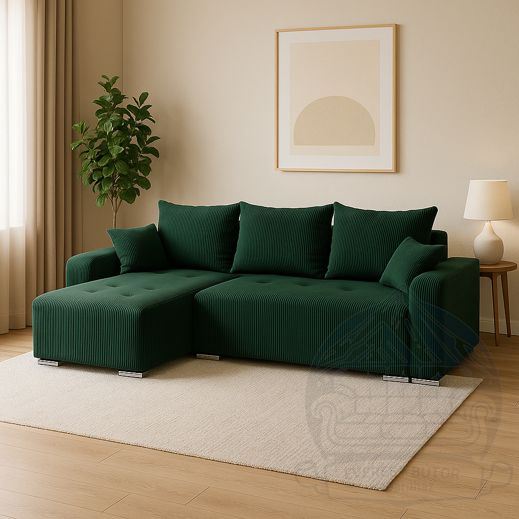 Ez a modern, L alakú sarokkanapé stílusos és kényelmes választás bármely nappaliba. Különleges, puha tapintású ford bársony szövettel kárpitozott, amely elegáns megjelenést biztosít, miközben strapabíró és könnyen tisztán tartható.
