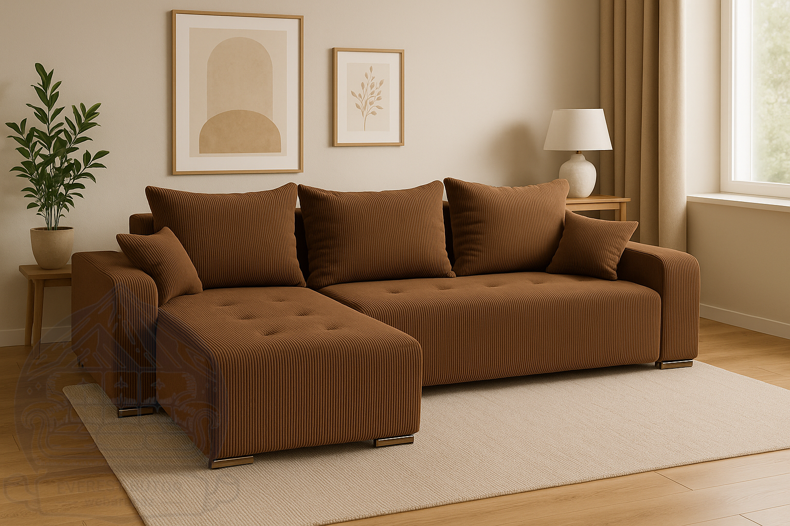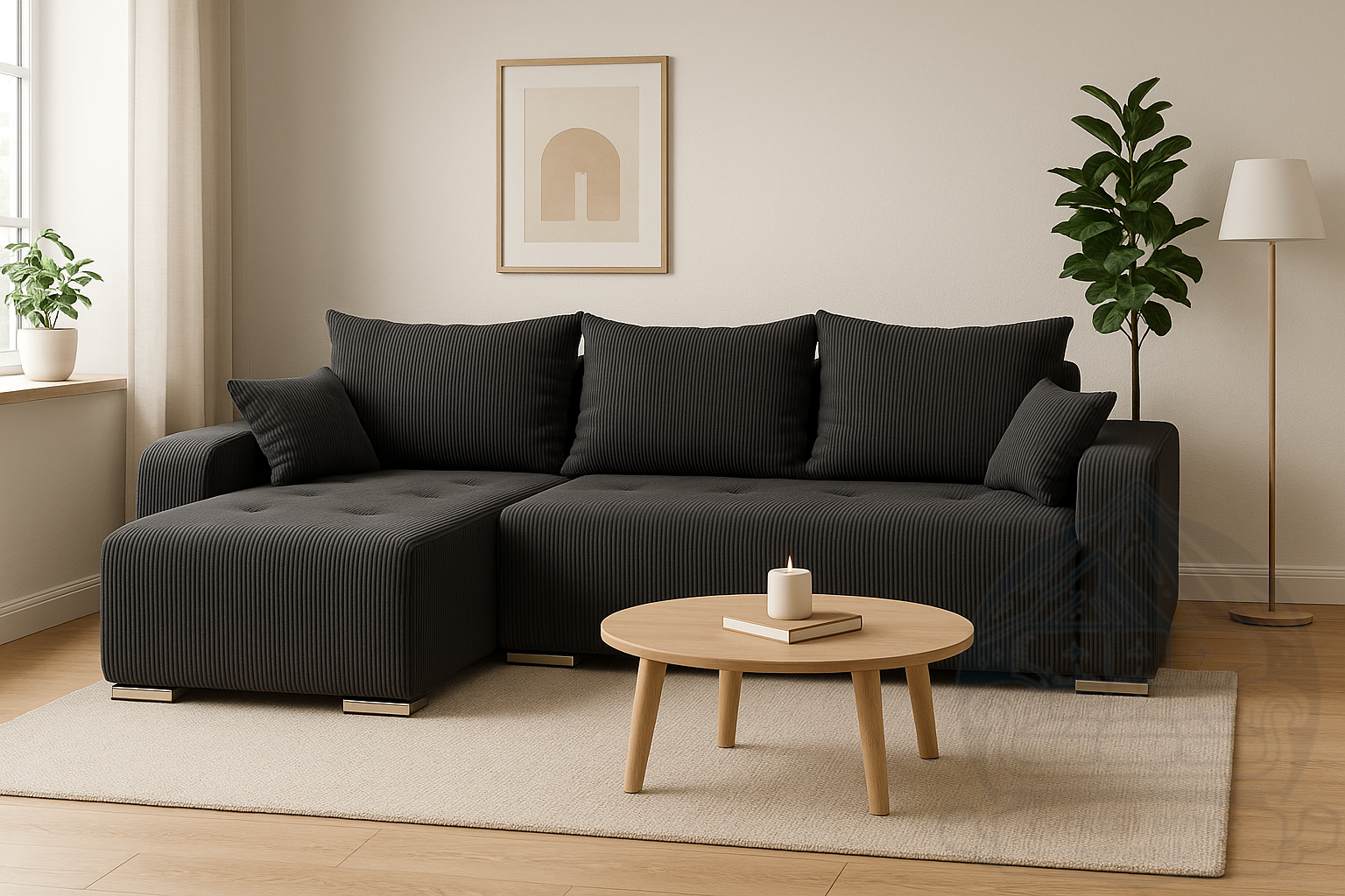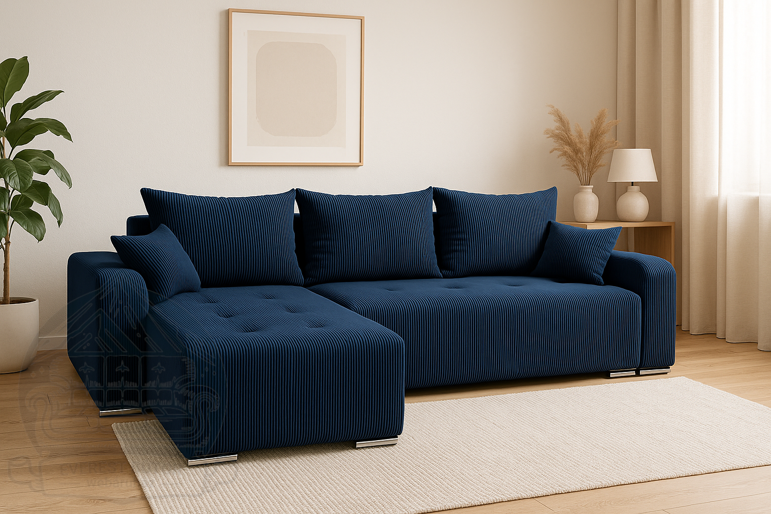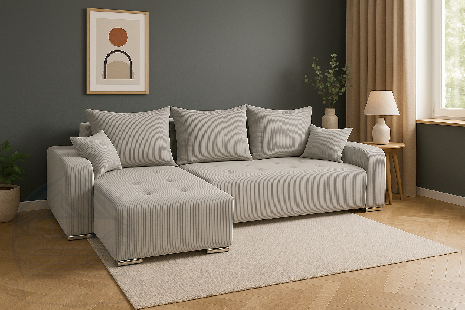 Ez a modern, L alakú sarokkanapé stílusos és kényelmes választás bármely nappaliba. Különleges, puha tapintású ford bársony szövettel kárpitozott, amely elegáns megjelenést biztosít, miközben strapabíró és könnyen tisztán tartható.